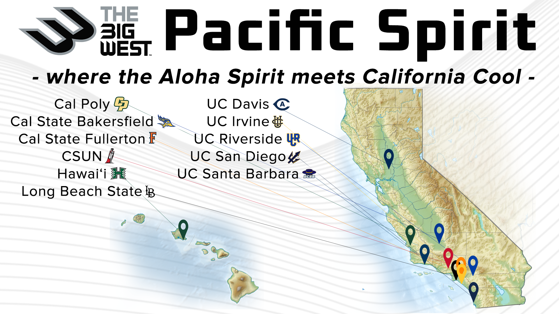 Formed in 1969, The Big West is a NCAA Division I member with 11 academically and athletically nationally proclaimed institutions. The Big West membership, consisting of Cal Poly, CSU Bakersfield, Cal State Fullerton, CSUN, Hawai'i, Long Beach State, UC Davis, UC Irvine, UC Riverside, UC San Diego and UC Santa Barbara are united in the pursuit of boundless opportunities, enduring integrity, bold activism, fearless innovation and the pacific spirit of freedom, exploration and progress.